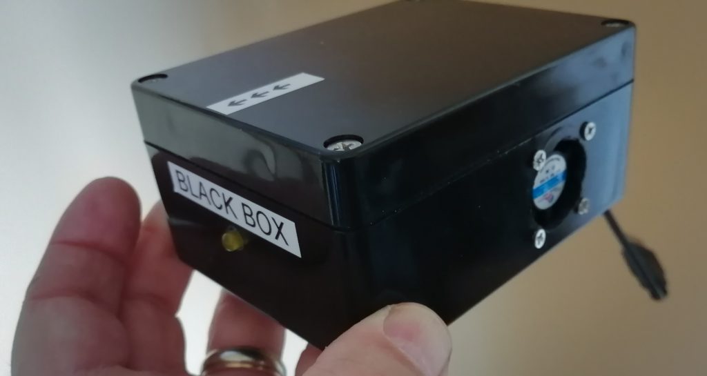 Our objective was to make Blackbox an independent system that would not compromise aircraft certification. In its present form, Blackbox uses a regular USB connector and the system can be powered from an external battery if no USB outlets are available on board. I personally used a 20,000 mAh, 3 amps Inui Power Bank battery during initial tests and was able to test Blackbox running continuously for over 10 hours.